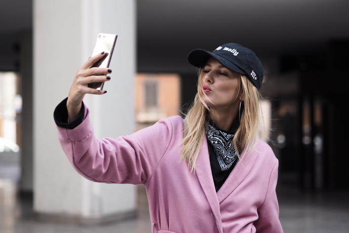 pink coat - NA-KD ze | sweatshirt, cap - Milion + zde | pants - Zara | sneakers - AM 97 ultra via Footshop zde | smartphone - Sony Xperia XZ premium
